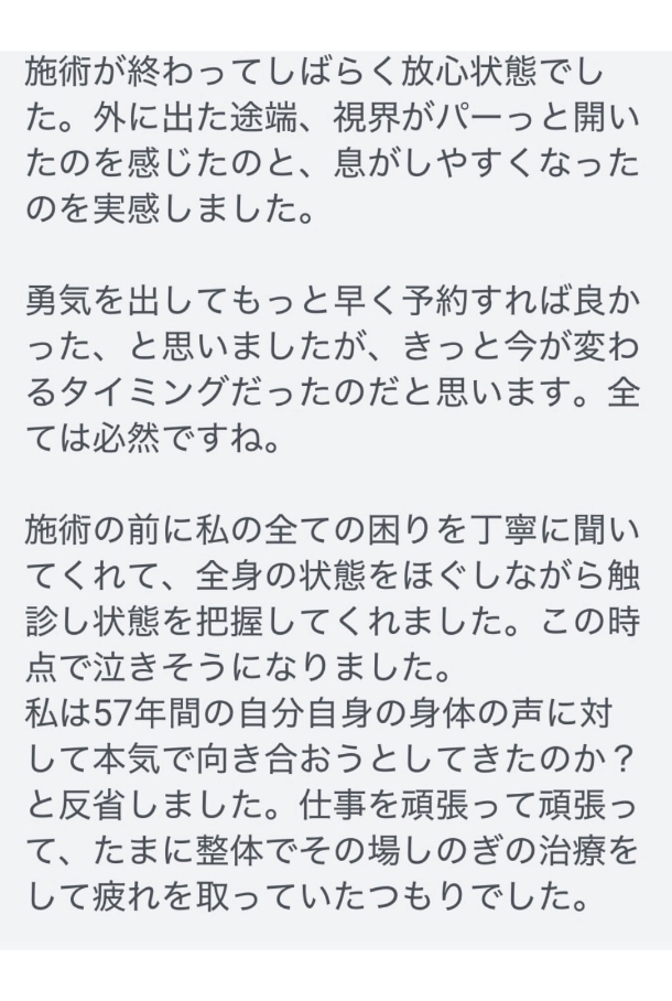 首・肩・表情筋・背面の深いコリがほどけるため、「視界が明るくなった」「呼吸が深くなった」「顔つきが変わった」など、一回での変化に驚かれる方が多くいらっしゃいます。